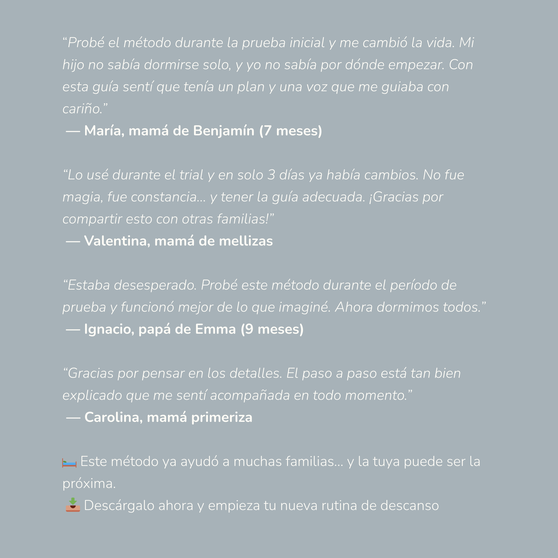 “Probé el método durante la prueba inicial y me cambió la vida. Mi hijo no sabía dormirse solo, y yo no sabía por dónde empezar. Con esta guía sentí que tenía un plan y una voz que me guiaba con cariño.”
